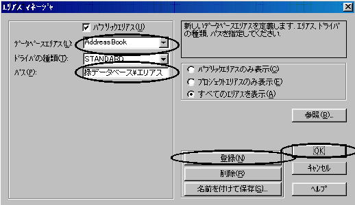 [データベースエリアス]のコンボボックスが空欄になるので、ここへ作成するエリアス名’AdressBook’を入力します。次に[参照]ボタンをクリックして、「ディレクトリ一覧」ダイアログボックスから保存先を選択します。先に保存先に「エリアス」などという名前をつけたフォルダを用意しておくことをオススメします。選択して[OK]ボタンをクリックすると[パス]にディレクトリ名が指定されます。[登録]ボタンをクリックし[OK]ボタン