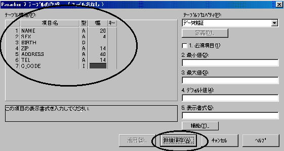 テーブルの作成ウィンドウが表示されるので、最初に用意した上のテーブルを参考に項目名、型、幅などを入力します。全ての入力が完了したら[新規保存]ボタンをクリックします。