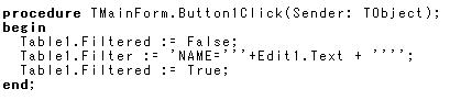 Filter := 'NAME'='''+Edit1.Text +'''' は、NAMEがEdit1.Textと同じものを選択しなさいというもので、フィルタの条件に合ったデータだけを参照することができます。