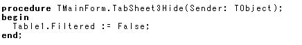 Filtered := False は、フィルタ処理を無効にするという意味です。フィルタ処理とはテーブルに指定したデータにだけアクセスできる処理です。