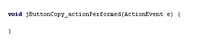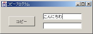 1行目の”void jButtonCopy_actionPerformed(ActionEvent e)”は、これがjButtonCopyをクリックしたときに 実行されるメソッド ※であることを表しています。 ※メソッドについては、第5章で詳しく扱います。 { と } の間に、「jButtonCopy」を クリックしたとき(イベント)に対応した実行処理 (この課題では、「上のテキストフィールド欄に入力した文字を下のテキストフィールド欄にコピーする」こと) を書きます。 |