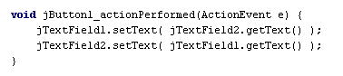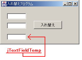 うまく入れ替えを行うためには、jTextField2.Text を取り敢えず保存しておく「テキストフィールド」 が必要です。 以下の空欄を埋めてプログラムを完成させ、動作を確かめてください。