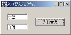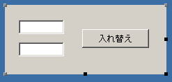 上下のテキストフィールドに適当な言葉を入れて実行してみましょう。 うまく動きましたか? 実はこのままではうまく入れ替えができませんね。 それは何がまずいのでしょうか? |