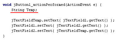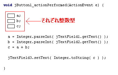 jTextFieldTemp はなくなりましたが、これで Temp という入れ物ができ、Temp が jTextFieldTemp の代わりをします。 jTextFieldTemp.getText() は String 型だったので、そのかわりとなる Temp も String 型でなくてはなりません。 そのため「String Temp;」と書きます。 (もし int 型が必要なら「int Temp;」と書きます。) |