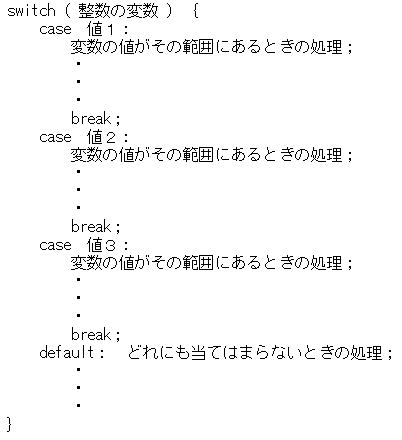 if〜else if文と同じような条件判断構造を作成しますが、判断する値の数が多いときにはswitch文で見やすいコードを書くことができます。