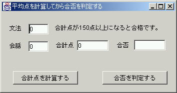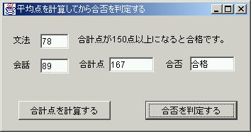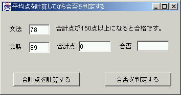 文法と会話の得点合計を求めてから合否を判定するプログラムを作りましょう。