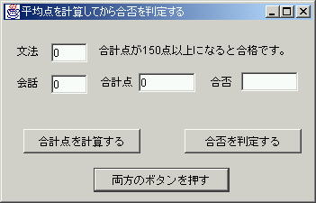 「文法」と「会話」の得点を入力してから、第三のボタンを押してみて、プログラムの動作を確かめましょう。