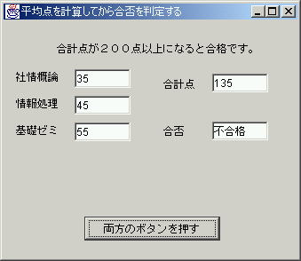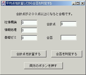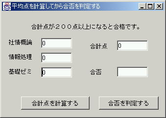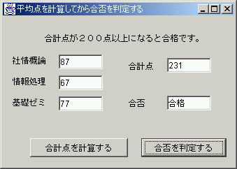 最後に、フレーム上にある「合計点を計算する」ボタンと「合否を判定する」ボタンを削除してから、動作を確認してください。 ![]() |