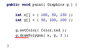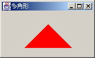 | drawPolygonメソッドは、指定した点を結ぶ多角形を描画します。 多角形の描画にはsetColorメソッドで設定されている色を使います。 また、fillPolygonメソッドで塗りつぶしの多角形が描画されます。 drawPolygonメソッドでは、描画に使う点を配列で指定します。 配列の値は、画面上のピクセルの位置です。