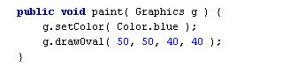 | Javaには楕円を描くdrawOvalというメソッドも存在します。 本章の最後に、その用法について簡単に学習しておきましょう。 drawOvalメソッドは、指定した2点で構成される長方形に内接する楕円を描画します。 楕円の色は今までと同様、setColorメソッドを使います。 また、drawOvalは楕円(空白)、fillOvalは楕円(塗りつぶし)となっています。 前節で学習したPolygonと一緒ですね。 基本的な使い方はC++BuilderのEllipseと一緒です。 しかし、違う点はJavaでは幅・高さを指定します。