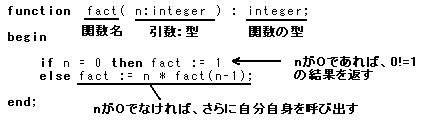 function fact( n:integer ) : integer; //(階乗を計算する関数)
