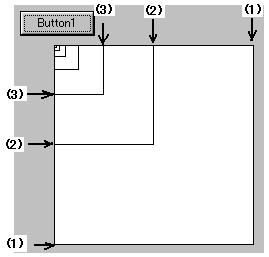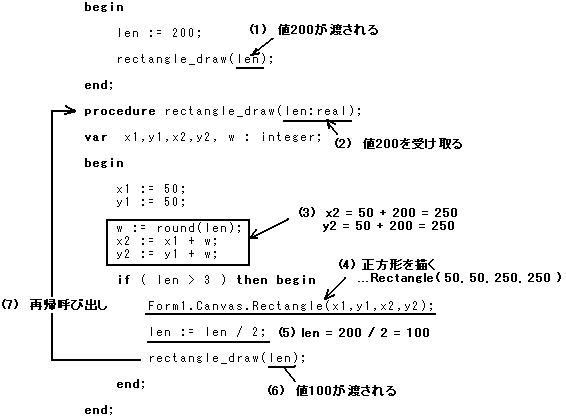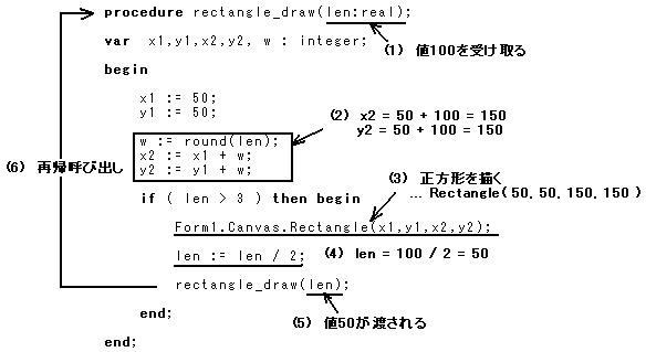 例題は以下の通りである。手続きの呼び出しごとに、大きさがもとの大きさの半分の正方形を描いていく。(このような作図は再帰を用いなくても描けるが、直感的な理解のために用いた)図中で(3)の位置にある正方形は、辺の長さが(2)の正方形の半分、(2)は(1)の半分となっている。