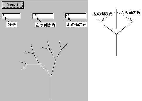 手続きの再帰呼び出しによって、樹木曲線を描く。樹木曲線の作図は次の規則に従って行われる。