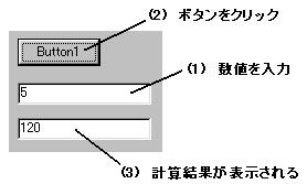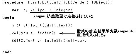 ここで、呼び出し側も見ておこう。整数型の変数nの値をEditコンポーネントから入力し、それを変数n(このように、呼び出される側の関数に値を渡すための変数を引数(ひきすう)と呼んでいる)入れて、関数factを呼び出している。関数名が通常の変数名と同じように扱われて、変数kaijyouへの代入が行なわれていることに注意しよう。