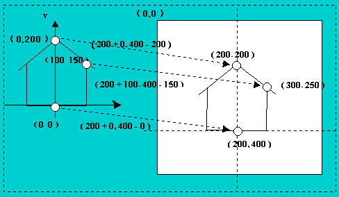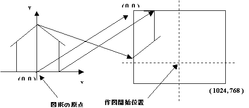 このため、作図を行うときにはもとの図形が画面の中央付近で、本来の向きに描かれるように座標値の変換を行う必要がある。