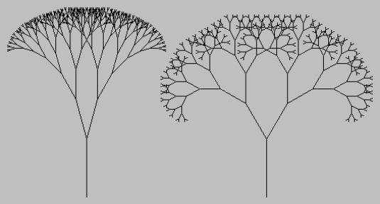 出力例2: 8次の樹木曲線:枝の間の角度が30度の場合(左)と60度の場合(右)